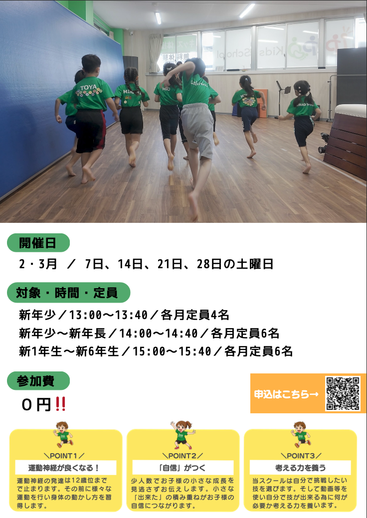 2月、3月限定で4回無料で通える体験教室を開催いたします。